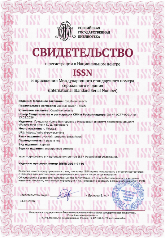 The scientific and legal journal «Judicial Power» is included in the Russian Scientific Citation Index (RSCI) and is registered in the Scientific Electronic Library eLIBRARY.RU.